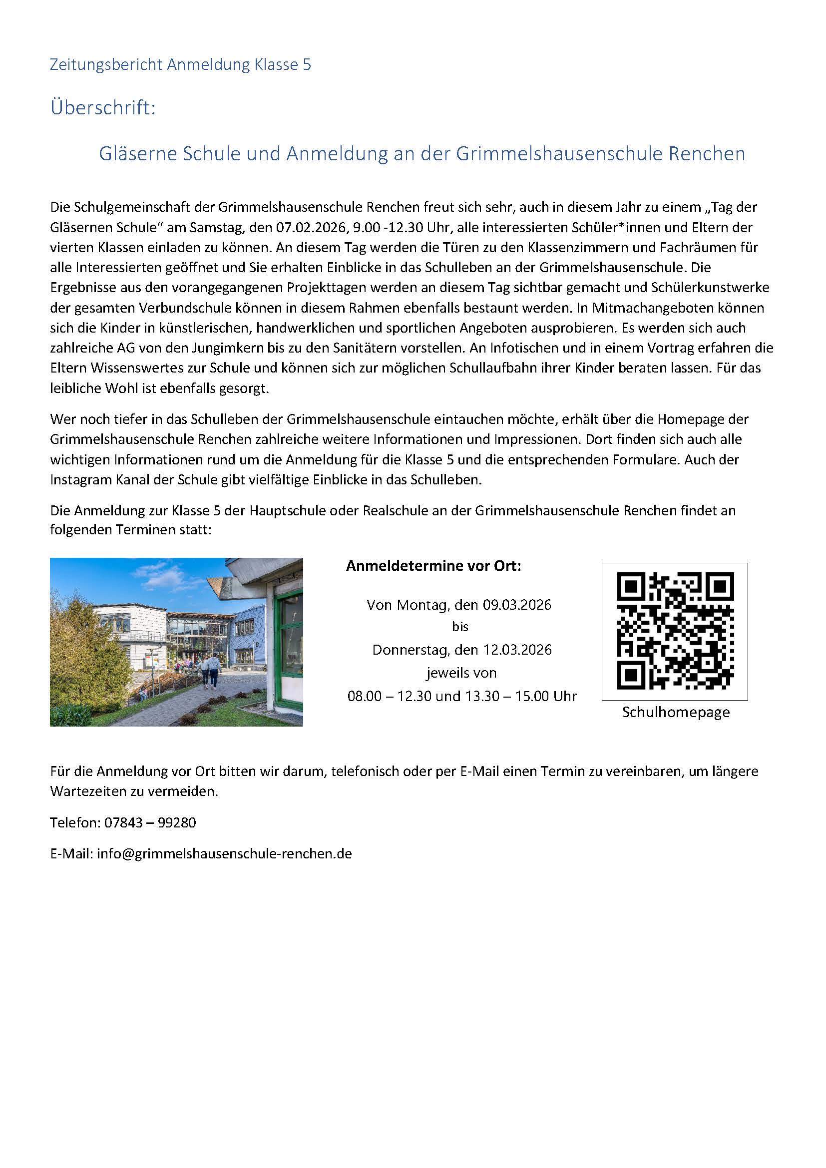 09. – 12. März Anmeldung zur Klasse 5 der Haupt- oder Realschule